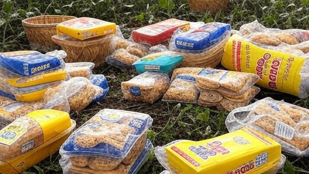 Mesa com alimentos frescos e embalagens de ultraprocessados, inspirando diretrizes alimentares contra produtos industrializados, modelo brasileiro.